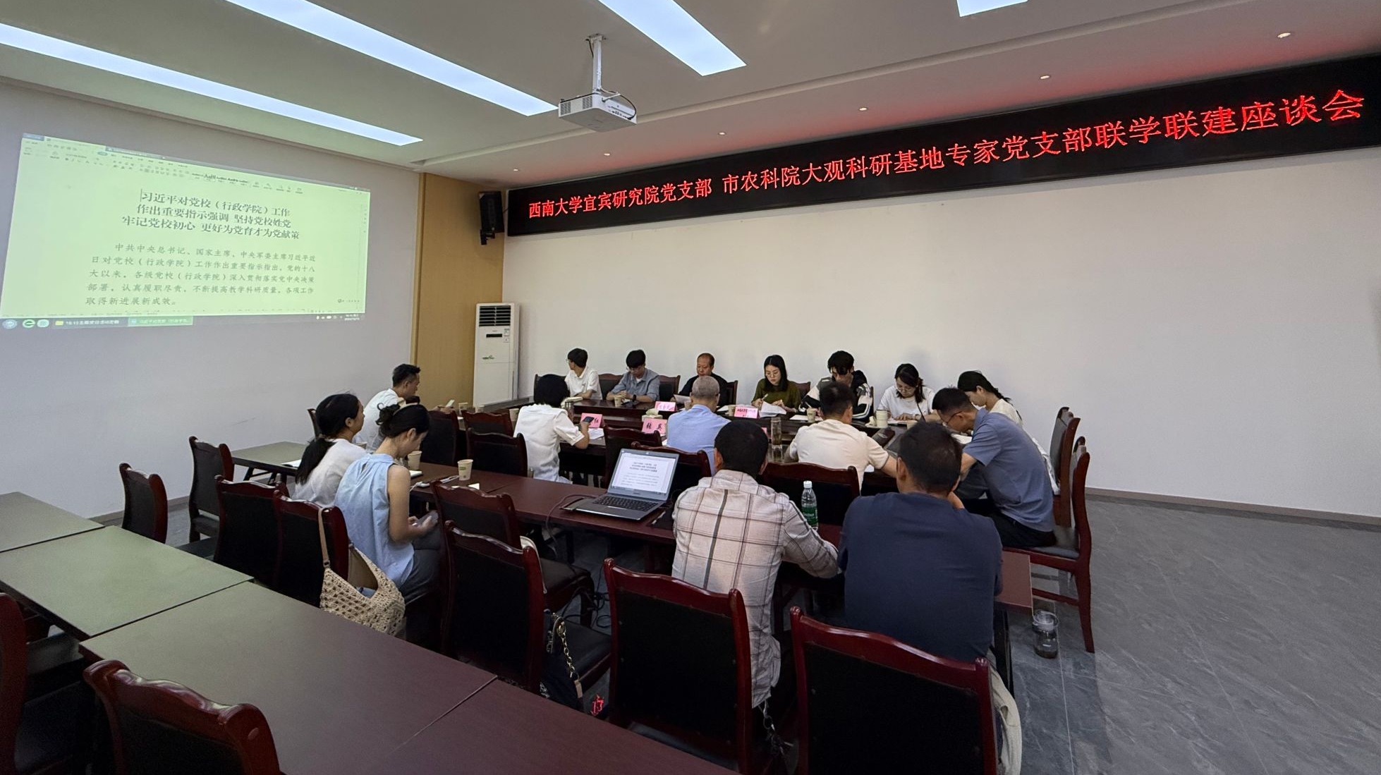 10月15日下午,西南大学宜宾研究院党支部与宜宾市农科院大观科研基地专家党支部联学联建开展“党建联建聚合力,协同创新促振兴”主题党日活动。两个党支部的党员同志齐聚市农科院大观科研基地,通过实地参观、集中学习和交流研讨,探索党建与农业科技深度融合的新路径。市农科院党委书记、市农业农村局党组副书记张英、市农科院党委委员、副院长詹映红、宜宾研究院院长陈金凤及双方党支部党员同志参加了活动。